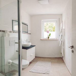 Das Badezimmer besitzt eine flach begehbare Dusche, eine Fußbodenheizung, einen Heizkörperhandtuchhalter, ein WC, ein Waschbecken, ein Fenster und einen Föhn.