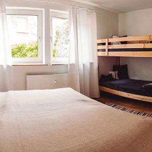 - Schlafzimmer mit Doppelbett und Etagenbett
