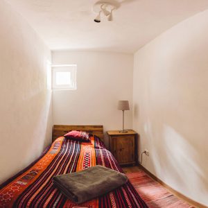 Das gemütliche Wohnzimmer ist mit einer Couch und einem Fernseher eingerichtet. Ein offenes Regal trennt den Wohnbereich von einem weiteren Schlafbereich. Es existieren 3 Schlafzimmer. Ein Schlafzimmer mit einem Doppelbett, ein Schlafzimmer mit zwei Einzelbetten und zwei weitere Einzelbetten im Schlaf- Wohnbereich. Das Badezimmer besitzt eine flach begehbare Dusche, eine Badewanne, eine Fußbodenheizung, einen Heizkörperhandtuchhalter, ein WC, ein Waschbecken, ein Fenster und einen Föhn. Der Innenhof kann gerne genutzt werden.