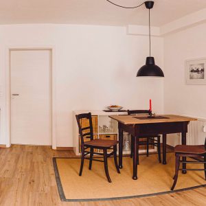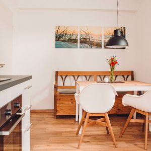 Die Ferienwohnung „Eyka“ befindet sich mit ca. 65 m² im Erdgeschoss und besteht aus einer hellen Wohnküche, einem großzügigem Flur, einem Schlafzimmer und einem Bad. Sie bietet Platz für bis zu 3 Erwachsene und 1 Kind.